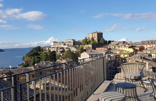The building has just been completely renovated and furnished with care and attention to detail. The rooms are spacious and very bright. The second floor apartment has two terraces and a balcony. In the larger terrace, connected to the Living area and to one of the three bedrooms, it is possible to dine in the shade with a precious view of the lake, the Bisentina island and the town castle (the Rocca). The second terrace, on the roof level, offers an extraordinary 360 degree view and allows you to take an aperitif and relax in the sun in total privacy and at night to appreciate the entire lake illuminated by the villages that surround it. The balcony, overlooked by the other two bedrooms, offers guests a unique panorama that arouses a feeling of joy and wonder.
