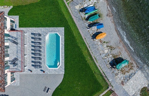 The swimming pool is 4 meters (13 feet) large by 7 meters (23 feet) long, 1.1 meters (3.6 feet) deep. It can be heated if requested (additional cost applies -- please enquire with our staff). The area is equipped with a sun umbrella and sun loungers. From the swimming pool you will enjoy a splendid view of the lake and of the mountains. The pool is open all year round.