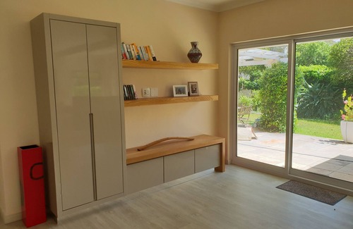 The beautiful villa with a special flair is very close to the Steenberg Golf Estates. It includes a large living / TV room, a very nice, functional kitchen with open-plan interior design to the dining room, equipped with modern and high quality appliances and 2 bedrooms and 2 bathrooms, all in the basement. The master bedroom is furnished with a large queen size bed (184cm wide), a dressing room with dressing table and small safe, and the ensuite bathroom has a long bath and separate shower stall. The second bathroom has only a shower cabin. All furniture is new or in very good condition. Between the garage and the dining room is a multifunctional housekeeping room (with a laundry room), which can also be used as an additional bedroom (only with toilet, no private bathroom).