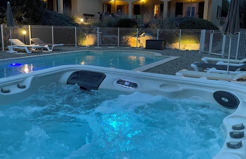 The environment will seduce you with its calm, its view and its sunshine, in the heart of the garrigue in a preserved place but only 5 minutes from all amenities and a very tourist area. With its exceptional views, its luxurious spa, its private swimming pool, your villa for 2 to 10 people offers you comfort, well-being and relaxation for a privileged and unforgettable vacation !!