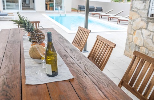 This modern Mediterranean style villa is designed as a complex that consists of the main house and the small stone house by the pool. The main house is on two floors and there is a large furnished roof terrace. The roof terrace offers a spectacular view of the mountain Velebit and Novigrad Sea and is great for people who love star and moon gazing at night. There is a spacious living room with a TV, a fully equipped kitchen and a dining area. In the main house, there are also three bedrooms and three bathrooms with walk-in showers. The small stone house has a large bedroom and a bathroom.