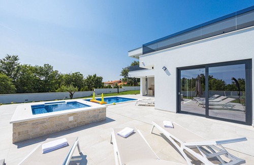 Are you dreaming of a luxurious holiday in the idyllic Istrian countryside? The luxury holiday home with the beautiful name MaEm truly offers a wonderful feeling for the relaxing holiday of your dreams. It is located in the medieval town of Svetvincenat. Up to 8 adults + 2 children under the age of 18 can find space here and can use the extraordinary luxury with pool and whirlpool. This villa has a beautiful view of the sea.