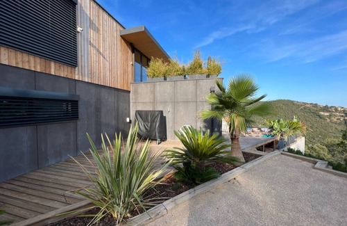 Architectural villa of 200 m², atypical due to its construction materials for the region. It has a large living space as well as a fully equipped American kitchen. Outside, a dining and relaxation area overlooks the swimming pool and the mountain. On this same floor, there is the master suite with shower and double sink. On the ground floor, find 4 bedrooms with double bed and bathroom, including one with bunk bed (sleeps 3) in addition. An office is accessible at the end of the corridor.