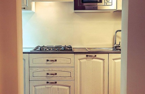 The second living room is paved with terracotta tiles. The ceiling has characteristic exposed wood beams and terracotta tiles. The furnishings are warm and welcoming, and include an armchair and a divan that unfolds into a double bed (140 cm/55 inches). In the living room you will also find a cooking area. The kitchenette is equipped with a four-burner gas cooker, a refrigerator with freezer, a dishwasher, a microwave oven, an Italian-style coffee-maker and a kettle. The dining table can accommodate four guests. In this room you will find a satellite smart TV. From the living room you will be able to enter the garden through a French door. The room has a high window, as well as a high window. It is equipped with underfloor cooling.