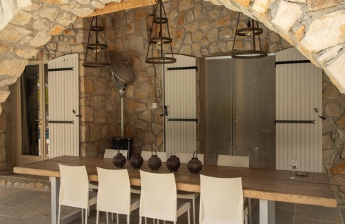 Beautiful, natural stone, detached villa with large surrounding garden with private pool, olive trees and picnic table. While enjoying a nice wine, you can enjoy a well-deserved, sun-drenched holiday here with unobstructed views over the beautiful garden and surrounding nature. The house has a spacious dining/sitting area and open-plan kitchen and living room with wood-burning stove. Cosily decorated and very comfortable furnishings. Satteliettv and wifi are available with Flemish channels and Netflix.
