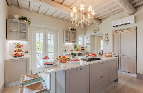 Lucca and the surrounding hills form a postcard-perfect panorama at Villa Noa. This stunning old farmhouse was built on a hill overlooking the city to take full advantage of the views, and was recently renovated to offer modern style and luxury. Invite up to sixteen friends or family members for a serene country retreat, or use the estate for a honey-moon- style getaway to one of the most scenic destinations in Tuscany. Drink in the views from outdoor living spaces with sitting and dining areas. Inside, romantic master bedrooms with marble-splashed bathrooms, a spacious fully equipped kitchen, air conditioning and Wi-Fi round out the list of hotel-worthy amenities. While the home’s surroundings are of a grand scale, the interiors of Villa Noa are cozy and inviting. In the open-plan living and dining room, warm neutral tones and slipcovered sofas and chairs lend a certain rustic elegance. The villa has eight bedrooms, including two on the ground floor for greater accessibility. Some of the rooms open to a balcony or to a porch. You can fall asleep to the sound of the wind meandering through the almost 700 olive trees that adorn the property and produce an exquisite olive oil. Like the main living areas, the bedrooms charm with warm neutral tones and farmhouse-inspired original furnishings. Set just outside the village of Marlia and close to the hamlet of Valgiano, Villa Noa puts you a short drive from Lucca old town, as well as a wide range of shops, supermarkets, restaurants, grocery stores, delis, bakeries and much more in the village of Marlia. Once at Villa Noa, catch up on some reading beneath shady pergolas, work on your tan by the glorious infinity swimming pool and take advantage of its jacuzzi corner while surrounded by your private view. A stroll through the woods of the estate will indulge your soul. In the afternoon, fire up the BBQ and grill something fresh from a local market. At dinner, the fully-equipped kitchen is sure to inspire your inner chef. Or, you could bring in a private chef to create a menu of delicious Italian cuisine. After dinner, take a bottle of wine out and sit on the pool-edge while the sun sets over the rolling hills. This region of Tuscany offers countless opportunities to experience the long and diverse local history, starting with enchanting Lucca (15 minutes away) with the best preserved Amphitheatre in the Roman world to Pisa, San Miniato and Montecatini Terme which are between a 30 to 60 minute drive away. Florence, San Gimignano, Versilia Coast, Chianti wine region and Cinque Terre (five mirage-like villages built along the dramatic coastline) are also fabulous historical sites to visit during your stay and are approximately a 1 hour drive away. Pistoia, Volterra, Siena, Bolgheri, Viareggio, Forte dei Marmi, Garfagnana, Valdinievole and the Versilia Coast are also all within easy reach. Or you can choose to enjoy the region as visitors have done for centuries: simply admiring the views and letting the surrounding vineyards and olive trees refresh your spirit.Directions: At the sign "Valgiano" (location provided) go straight on the dirt road and always keep to the right until you reach the gate with the white walls (Villa Noa).COMPOSITION:Ground Floor: entrance hall, grand living room, kitchen, dining room, 1 master bedroom with double bed and ensuite bathroom, 1 master bedroom with double bed, 1 bathroom, porch/verandaFirst Floor: 2 master bedrooms with double beds and 2 ensuite bathrooms, 2 twin bedrooms with 2 ensuite bathrooms (one of which has a balcony with view that provides access to the 7th and 8th bedrooms as specified here below. On the first floor there are 2 more master bedrooms with double beds with 2 ensuite bathrooms (one of which comes with a private terrace with view) accessible through a separate entrance from the garden or through the balcony of one of the twin bedrooms.Note: Fireplaces are not usable. The number of guests must meet the maximum occupancy indicated, children included, and no additional guests, nor parties or events, are allowed.Included in the rental price:Final CleaningTowels and linensElectricityGasWaterInternet WifiHigh chair (upon request at booking)Babycot (upon request at booking)Not included in the rental price:Tourist tax: mandatory and required by the local municipality, where applicable.Midstay and/or weekly cleaning and change of towels and linensBaby cot's linens