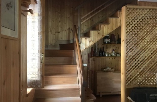 The property, well furnished and finished in wood, is in excellent condition and excellent maintenance conditions. "It is structured as follows: ground floor, open space entrance with living area furnished with table for 6 with wooden bench and chairs, sofa bed double bedroom, 2 armchairs, fireplace, TV, radio, large window and comfortable kitchenette with closet; first floor: corridor, with built-in wardrobes, where 2 rooms are distributed, the first with a bunk bed + French bed served by a staircase in wood and window, the second, with double bed, TV, wardrobe and large window overlooking the Pratone, 1 bathroom with shower and window. Private outdoor area, with gate, furnished with bench and masonry table.