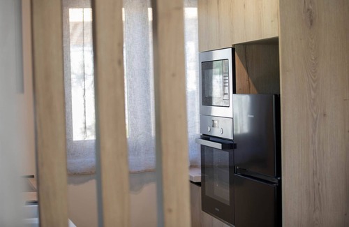 Villa Olea is a two-storey building fit for 4 people. On the bottom floor there’s a fully equipped kitchen, with every utility you might need, the dining area, a toilet and finally, the living room installed with a fireplace, where you can kick back and marvel at the view before you through the large glass window.