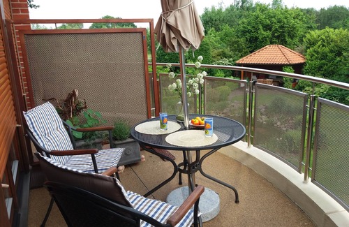 A 60 m2 apartment in my modern villa from 2000. Bright rooms, wooden floors, bright bathroom, no sloping ceilings, built-in wardrobes, kitchen integrated in the living area, sun balcony, garden use, storage space for bicycles in the double garage, plot with its own gate entrance, large parking space in the courtyard, view of nature, located near the meadow ground 10 to 12 minutes on foot to the town center. Bicycles available.