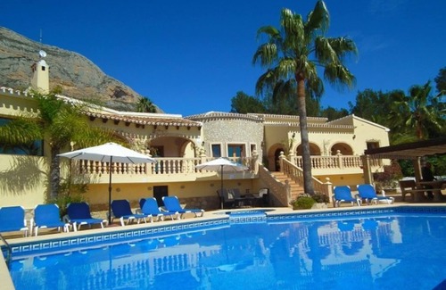 Villa Orquida is a luxury six-bedroomed villa situated in its own private and secure grounds within the secluded Mount Montgo National Park area. Its large, floodlit pool with its combined Jacuzzi is set in a huge poolside leisure area, all of which faces south and enjoys the sun from morning to evening. Adequate sun loungers are provided and there is a covered gas-fired outside BBQ bar and kitchen with a retractable seating for seating for 16 people. A fully equipped toilet and poolside shower room is provided, plus a separate outside bar and a shady "nook" with stone seating and table.