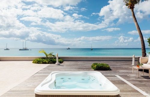 Covered and open terraces, defined by columns and arches, span the length of the villa. The large horseshoe-shaped heated pool sits at the sea's edge. In the center of the horseshoe is a covered loggia for relaxing and dining poolside. A hot tub sits nearby for ultimate relaxation. Additionally, the villa has an on-site manager skilled in taking care of your needs and easy access down the beach to Grand Case Beach Club restaurant and bar.