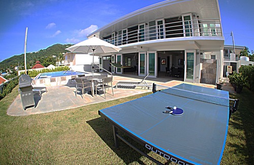 Come and enjoy this beautiful Beach House! Secluded Neighborhood and Family oriented! Ocean view Villa with a private pool!!! On upper level spectacular view from Master bedroom with special bathroom suite, plus two additional bedrooms with bunk beds, twin on top and full on bottom with trundle twin bed. On this level also one and a half additional bathrooms, a full kitchen with TV (Dish Network) on the master and family area.