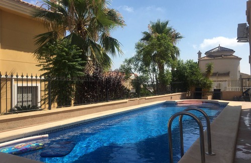 A specious 3Bed villa with 2 Bathrooms, balconies, fully equipped fitted kitchen/utility room and a privet swimming pool in Orihuela-Costa. The property is equipped to sleep 6-8 adults and its close to blue flag beaches (10 min drive) La zenia Shopping mall and surrounded by 3 golf courses. Restaurants, pubs and supermarkets are within walking distance. A car is necessary if you wish to explore surrounding regions. There are plenty of activities for both adults and children nearby (free Parking is available). There is a downstairs bedroom and bathroom with a walk-in shower cubicle suitable for accompanying elderly. although there are five steps to entre the property. The upstairs bathroom has a Jacuzzi bathtub and an overhead shower. the property has both AC and fans fitted throughout. there is plenty of outdoor space for activities.