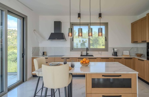 As you step inside, you'll notice the sleek and contemporary minimalist decor, with large windows that provide an incredible view of Kalamata Bay and plenty of natural light. The spacious open living room is furnished with a comfortable wrap-around sofa, high-quality furniture, and a cosy fireplace, as well as a flat-screen TV. The adjacent dining area offers plenty of space to enjoy meals together, while the well-equipped kitchen provides all the tools you need to prepare your favourite dishes. Stay connected throughout your stay with fast Wi-Fi available throughout the villa.