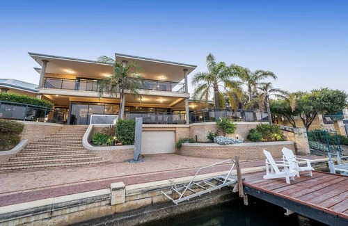 Relax and unwind at Villa Santavea, a private luxury resort on the Mandurah Canals. Boasting 5 BD, 4 BA, tennis court, giant swim spa and private jetty. Enjoy 180 degree water views from the first or second story. Grab a bottle of wine and relax on the dock. Private jetty for your boat with direct