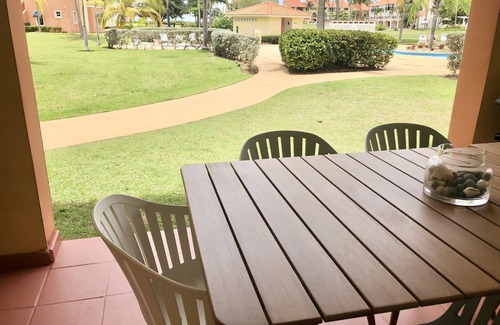 Ground floor 2 Bedroom, 2 bathroom villa. Steps from the pool and jacuzzi. The villa is beautifully decorated with coastal theme. It is located 200 yards from the beach and next to the Wyndham Hotel & Casino.