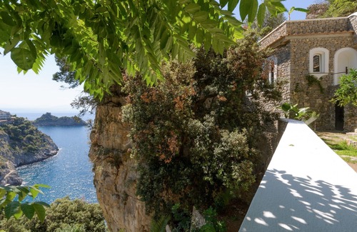 VILLA Shah, surrounded by 15000 square meters of typical Mediterranean vegetation, stands on a promontory overlooking the sea with a breathtaking view in the heart of Amalfi Coast in Conca dei Marini and is located 3 minutes drive to the beach, 10 minutes from the center of Amalfi and 20 minutes from Positano. It overlooks the enchanting Emerald Cave and Cape of Conca. A pleasant sea view walk about 200 meters in the property among olive trees, holm oaks, fig trees, oaks, jasmine, capers and prickly pears will lead guests to the Shah, located in a privileged position of total privacy. The interiors of the Shah offer two exclusive suites with 3 private bathrooms, in rock and marble, with whirlpools. In close symbiosis with the Shah, the agricultural company of relevance, synthesis, with its terraces on the sea, of a new way of conceiving the reception, which translates into the possibility for guests to taste the natural products of the garden, besides selected gastronomic excellences of the territory. The Shah is located in Conca dei Marini and access to the estate can be had from the municipal road that leads to the center of the small village of Conca dei Marini through 110 steps, both directly from the State Road 163.