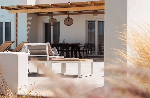 Villa Solena, a brand new built villa with design being a priority throughout the villa to ensure plenty of sunlight and eye catching views of the sea stretching as far as Chora town. The white colours throughout the villa allow serenity and tranquility to be able to enjoy all times of the day.
