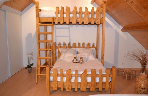 A room equipped with a bed in 160X200, a bed in 140X190 and a bed in mezzanine of 90x190