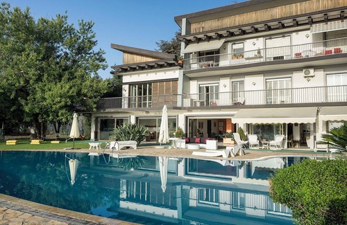 Villa del Cavaliere Grillo features 3 floors with spacious living areas, 10 bedrooms, multiple kitchens and panoramic terraces. Enjoy indoor and outdoor dining, a pool with direct access, and fun amenities such as a pool table, table tennis, trampoline, and basketball hoop—perfect for relaxing and entertaining in a charming setting.