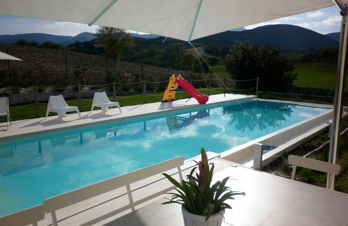 Immersed in Le Marche's green hills, 5 km from Umbria, the villa with swimming pool is the result of the fantastic restructuring of an old rural building. Quiet and panoramic views are important elements of this villa.