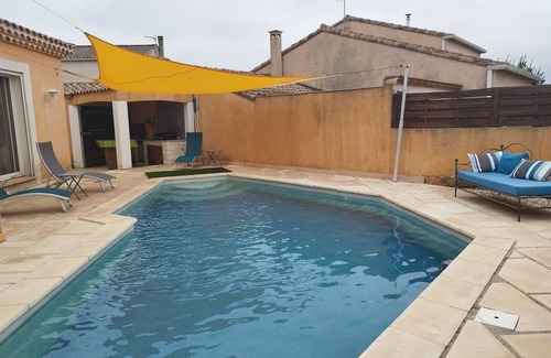 Villa of 143 sqm on a plot of 550 sqm fully fenced with pool, summer kitchen and terrace. Quiet neighborhood, near downtown and shops. Near the Canal du Midi, Massif Caroux, Lake Salagou, Pézénas Cap d'Adge, Montpellier and 100 km from Spain.