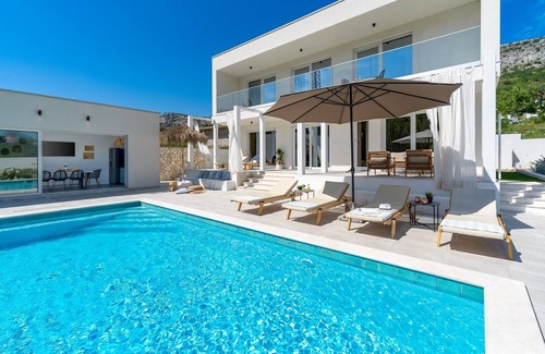 Gorgeous, designer-furnished Villa Zen is fully equipped with all appliances a modern guest needs for a comfortable stay. Decorated with exquisite taste and style, the functional and relaxing interior, is quietly positioned and enabling high quality living in the rural area of Omiš hinterland. Offering living and dining area with glass walls toward the pool area, fully equipped kitchen, fireplace, a summer kitchen with BBQ next to the pool, 4 bedrooms, 4 bathrooms, fully airconditioned, and free WiFi.Located in a quiet area of Tugare village, with a bakery, a minimarket, a bar within walking distance, a traditional restaurant Palacio in 5 min drive, only 10 min drive to the sandy and pebble beach, supermarkets and many restaurants in Omiš, a small Mediterranean town that offers lots of activities and historical attractions.