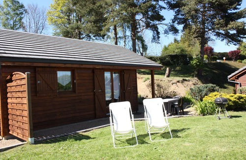 cottage with terrace garden furniture sun lounger and barbecue full south with a remarkable view on the largest natural lake of Auvergne. In holiday village
