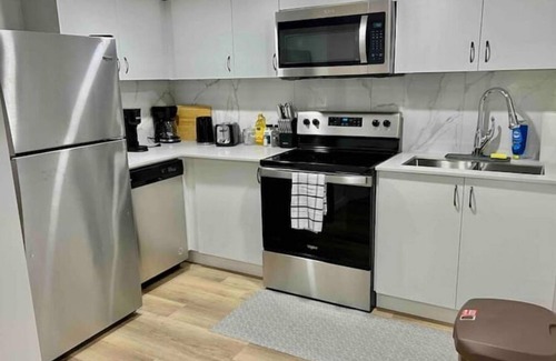 The suite includes a full kitchen with brand new stainless steel appliances from Whirlpool. The kitchen provides granite countertop and some appliances in the kitchen include an electric stove/Oven, spacious fridge, blender, rice cooker, air fryer, toaster, water boiler, drip coffee maker, Keurig coffee pod machine and kitchen essentials (utensils, oil, salt, pepper, pots & pans, glasses, cups, etc.).