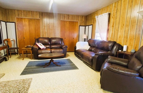 Welcome to our 70s cabin—where "vintage" is just a fancy way of saying "timelessly outdated"! With its classic paneled walls and linoleum flooring, you’ll be knee-deep in nostalgia and golden tones. Just a hop, skip, and a jump from the Lake and Corps land, this place isn’t about Insta selfies; it’s for crashing after a day at the lake with family and friends fishing, hunting and Lovin’ Life. Kick off your boots or flip flops and soak up the country life. Don’t worry, we’ve snuck in some perks like plenty of room for boat parking, internet, leather furniture, and indoor plumbing—because even in the wild, we believe in the magic of not having to use an outhouse.