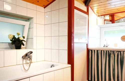 Layout: Ground floor: (dining room, Kitchenette(hob(4 ring stoves, induction), combination microwave, dishwasher, fridge-freezer), Living/bed room(double bed(160 x 210 cm), stove(wood)), bathroom(bathtub with shower, shower, washbasin, washbasin), toilet)