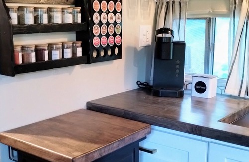Enjoy a classic camper without towing or setup. This fully restored Vintage 30' Holiday Rambler is permanently parked and converted to a sleek tiny home. All modern conveniences & comforts in a unique, fun space promises memorable moments of relaxation on the patio/deck around your private plunge pool. Grill out, chill out & experience a simpler time - but with wifi and heating & air conditioning...The Holiday Rambler at Steele Magnolia features a bedroom with twin beds that can convert to a queen. The living room couch also converts to a twin bed. The wet bath has a shower & real toilet. A huge kitchen for a Glamper, features under counter fridge/freezer, large undermount sink with gooseneck faucet, wood counters, induction burner, microwave, Keurig and convection/air fryer/toaster oven. The living room features a vintage inspired tulip swivel chair and smart tv. Just outside the door is the pool/patio area with firepit. Parking for two cars -side by side (no trailer parking unless you unhitch!) Perfect for a couples weekend or girlfriend getaway, The Holiday Rambler is a cozy yet quirky place to unwind.