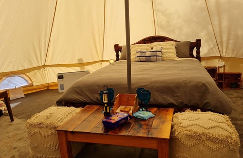 Horizon to horizon views in native Australian bush at the Murray River. Watch the kangaroos hop by in total peace outside and all the modern experiences inside. Hot water shower and kitchen with firepit and outdoor set. Cable internet included with Wifi, TV and Netflix. Your pets are most welcome too. Very large 6m diameter tent. Contact for the homestead provided upon arrival for instant, 24/7 support.