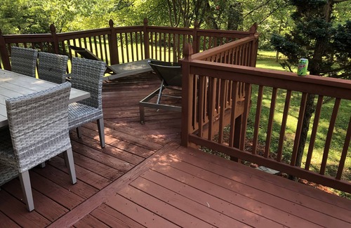 This spacious home is 14 miles from Monticello, in a rural setting, yet with restaurants, groceries and shopping just 3 miles away at Zion Crossroads. Huge kitchen, deck and living spaces. Big yard. Two car garage has been set up as a game room, with ping pong table, foosball, AirHockey, and a huge TV for streaming movies, hooking up your game consoles, etc. See the pictures.