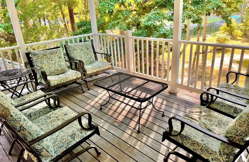 The spacious family room offers comfortable seating and a large 55” TV.. The family room and kitchen open out to the huge upper deck with lots of comfortable seating and great views of the lake and backyard! On this one deck alone, there are three seating areas: sink into the comfortable chairs in the covered deck area with ceiling fan, do some bird watching from the rocking chairs under the canopy of the trees, or enjoy a meal on the small outdoor table! We regularly see a pair of bald eagles and flying squirrels from the back deck; it's incredible! There is also a lower deck that offers another great area for enjoying the beautiful outdoors with additional comfortable patio seating, providing you with multiple areas to spend time with your family and friends.