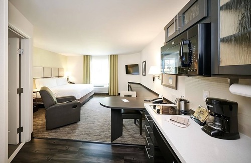 The hotel's spacious guest rooms are finished to a modern standard and feature either queen or twin-bed configurations. All rooms offer a range of convenient amenities, including a flat-screen TV with premium movie channels, free Wi-Fi, a living space, and a full kitchen complete with a stovetop, microwave oven, full-size refrigerator, cooking utensils, and a dishwasher.