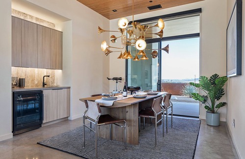 The three bedrooms are all equipped with premium spa-style en-suite bathrooms featuring gorgeous stone surfaces and high-end finishes. The bedrooms each have private access to outdoor patio space or the pool area, which includes a fire pit, lounge chairs, an outdoor shower, and outdoor dining table. An airy, open layout invites you and your group to dine, drink, relax, and share moments together, all while enjoying spectacular views of Joshua Tree National Park through oversized glass doors. You ll also have an additional lounge space in the finished garage, with a desk, sofa bed, TV, arcade game, and a ping pong table