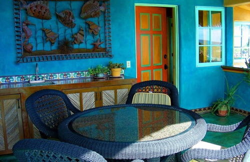 El Encanto's Vista Suite includes a large bedroom with King bed and bathroom with large covered patio with incredible views. Watch the sunrise or the full moon rise from the sea. Keep drinks and snacks in the small refrigerator. Coffee and tea service included. Read or lounge in the comfortable hammocks. We're only a 2 minute walk to the beach, and no more than 5 minute walk to all dive shops and restaurants. You have use of snorkeling gear, beach chairs, umbrellas, and ice chests. Use the outdoor shower to clean salt and sand off after the beach. Watch whales from the patio in season. Includes wonderful attention to detail, original art, native craft, a safe for your valuables and much more. Beautiful handmade palm frond palapa roof. Air conditioning available for an extra charge. There's plenty to do in Cabo Pulmo: diving, snorkeling, swim, hike 20 miles of trails, rent a mountain bike, go sport fishing, whale watching or go on a rancho tour.