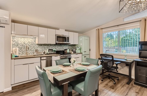 The dining area features a modern dining table that is set for four and is located conveniently next to the kitchen. The kitchen equipped with high-end kitchen appliances electric stovetop, oven, full-sized refrigerator/freezer, dishwasher, microwave with extended vented hood, Keurig coffee machine, tea kettle, blender, toaster, Unique Fridge and as well as everything you need to prepare your favorite recipes. Complimentary snacks.