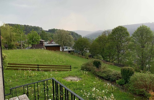 Location... The property is located in the district Klingenthal in the beautiful place "Oberzwota" near the Czech border. It is about 40 minutes to Karlovy Vary. The Finnhütte is located at the highest point of the village (730 meters above sea level) with a beautiful view into the valley. The location in the heart of the Vogtland is ideal for relaxing and relaxing in nature. The accommodation is also very suitable for active tourists. There are good cycle paths as well as hiking trails in the immediate surroundings. On foot, by bike or in winter on skis, you will find a well developed forest road network. The area from Klingenthal via Zwota to Erlbach and Schöneck is a winter sports resort with many cross-country ski runs, slopes and lifts. Directly behind the Finnhütte is a cross-country ski trail. With numerous connecting loops, it forms a very nice cross-country skiing area and is one of the longest, most beautiful and snow-sure trails. In the vicinity you will find beautiful romantic forest lakes in connected forests with numerous streams and small rivers. Equipment... The plot has an area of approximately 305 sqm and is equipped with a larger massive Finnhütte (42 sqm) with small terrace and small balcony. The accommodation can accommodate up to 4 people. The sleeping places are located in the top floor of the hut. They are all single beds. The accommodation is winterfest. The decor is simple and rustic, but it is everything you need. In the kitchen there is a sink with hot and cold water, a refrigerator, a water cooker and a coffee machine. Next door is a small bathroom with shower, sink and toilet. In the lounge is a table with seating for six people. There is also a small barbecue on the property. Please note ... In the Finnhütte, there is a steep staircase leading to the sleeping area. The walk to and from the sleeping floor is only possible for small children under supervision. Even for older adults this staircase can be a challenge. This is to be considered when booking. Also I would like to point out the pets (pets = dog, event. Bird) per day 5.00 Euro and a final cleaning of 10.00 Euro will be charged. We are looking forward to your visit! Your VogtlFinn's