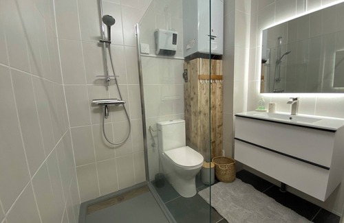 The bathroom is equipped with a shower and provided with shower gel and shampoo, as well as bath towels.