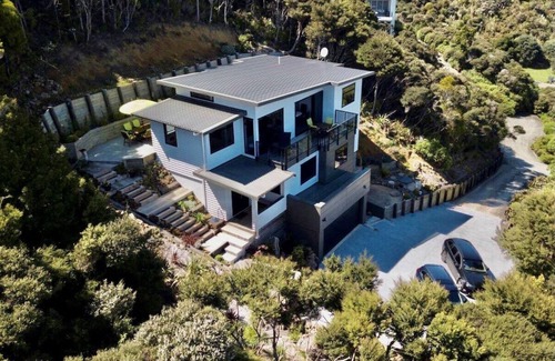Whangaumu 91 is a well equipped, modern, multi-story house with multiple indoor and outdoor living spaces. The house is on the hill immediately above the beach, set in native bush, and has stunning beach and sunset views, yet only a 3 minute walk to the beach. Wake up to the sounds of waves crashing on the beach below, and tuis in the trees outside.