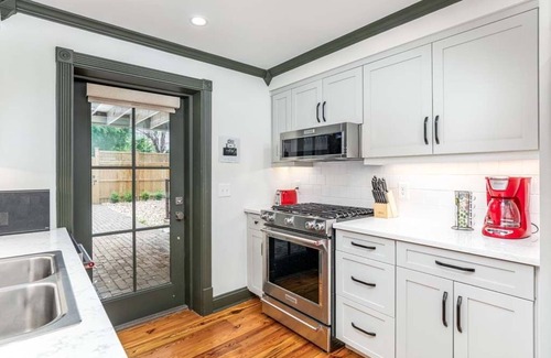 The quaint ground-level garden apartment is perfect for a couple or a small family visiting Historic Savannah. The spacious apartment offers a private entrance with its covered patio and a shared courtyard and garden. The interior has been renovated and includes one bedroom with a Queen size bed, a full bathroom with a beautiful all-new walk-in shower, and a parlor-style living area with a sleeper sofa and a flat-screen TV. Plan to prepare excellent meals in the all-new kitchen, fully equipped with stainless appliances, new cabinetry, quartz countertops, and a four-burner gas range and oven.