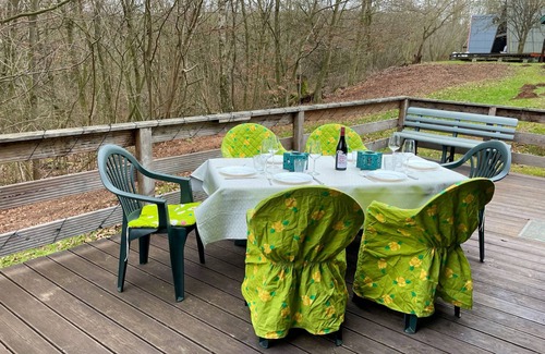 Ferienpark Twistesee 3 km from Bad Arolsen: Timber house "Waldglück". 100 houses in the resort. In the district of Wetterburg, 3 km from the centre of Bad Arolsen, 500 m from the lake, in the woods. For shared use: property 33 ha, trees, meadow. Nat. Swimm. Pond, fireplace, children's playground. Available: bicycles (2). Central parking spaces. E-charging station. Shop 3 km, supermarket 3 km, restaurant 1.5 km, bus stop 100 m, railway station "Bad Arolsen" 4 km, outdoor swimming pool 3.5 km, indoor swimming pool 4 km. Golf course (9 hole) 800 m, minigolf 500 m. Nearby attractions: Bergpark Wilhelmshöhe, Schloss Wilhelmsthal. Please note: car-free holiday complex. The lake with sand/grass beach and waterski facility is about 500 m away via a forest path.