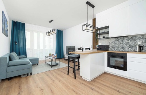 This stylish apartment has been designed with comfort and a cozy atmosphere in mind, making it an ideal place for a relaxing stay for three people. The thoughtful décor and carefully selected furniture enhance the quality of the stay, making every moment spent here special. It consists of an elegant living room with a kitchenette, a separate bedroom, and a bathroom with a shower. An additional advantage is the balcony with garden furniture, perfect for relaxing with a cup of tea. The living room features a comfortable sofa, ideal for enjoying evening movie sessions on the Smart TV. Furthermore, the sofa can also serve as a bed, providing a comfortable night's rest. The kitchenette is fully equipped with essential appliances such as an oven, microwave, and induction cooktop, encouraging culinary discoveries and the pleasure of cooking. The bedroom offers a large, comfortable double bed that ensures a restful sleep. The apartment is equipped with fast Wi-Fi, providing convenient internet access throughout the stay. The bathroom includes a washer-dryer, enhancing comfort, especially for longer stays. The interior, decorated in light colors, exudes coziness, creating the perfect environment for relaxation and rest. Large windows allow an abundance of natural light to fill the space, enveloping it in warmth and harmony.