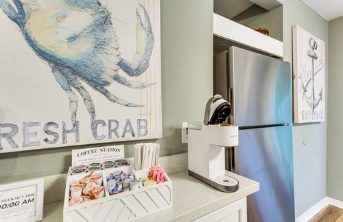 - Keurig pod coffee maker (starter coffee pod supply w/ creamer & sugar provided)