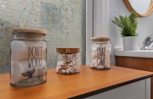 Downstairs you will find a large living room (with queen pullout couch) and open concept dining space, with plenty of space to socialize, have meals, and entertain. Pass through the dining area to a fully stocked kitchen with a coffee bar which also attaches to a spacious laundry room. You will also find a large bathroom with a tiled shower and extra toiletries to fit all your needs on the first floor.