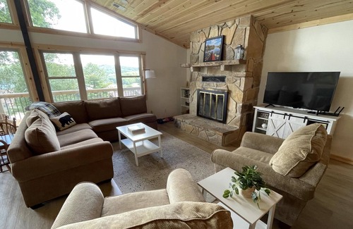 This home is beautifully updated with amazing views and within walking distance to the lake. The Refuge sleeps 10 (ten) and has plenty of parking for all of your guests in the horseshoe driveway. As you pull in you will see the double decks with an entrance into the first floor. Walking in you will find plenty of space to unload all of your belongings with quick access to the 3 (three) downstairs bedrooms and 1 (one) full bathroom. Bedrooms one and two each have a queen size bed, bedroom three has a full bed and a twin over twin bunk bed. Laundry access is also available on the first floor.