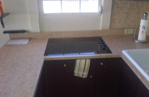 One newly remodeled bathroom with a shower and kitchen with a 4 element glass top.