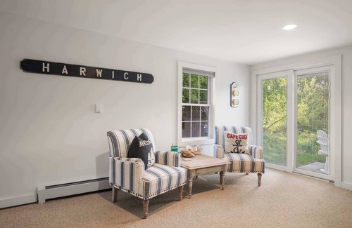 Getaway this summer at our Harwich Cape House-- the perfect home base for an exploring family of up to 6! Just two minutes from the small Mill Pond and trailhead, enjoy your mornings walking your pup around the kettle hole or hiking along the weaving trails and relax in an Adirondack chair on one of two patios. The large yard is a great space for kids and a dog to play! Spend the afternoon on the land exploring Hawknest’s State Park, on the water kayaking and fishing from Muddy Creek all the way to Jack Knife Beach, or getting your saltwater fix at Forest or Cockle Cove Beaches. This home features a modern kitchen--newly renovated with a soft seafoam colored backsplash, crisp white countertops and cabinets, and gleaming Stainless Steel appliances. Enjoy a family meal at the indoor dining table or outside on the back patio (complete with an Outdoor Heater to keep you warm even on those chilly shoulder-season nights!) After dinner, get comfy on the oversized sectional and watch TV, or head into the bonus room to play a competitive board game with the family. Between the kitchen and the dining room, you’ll also find the first of two full bathrooms-- simple, clean, and boasting a beautiful white subway tile shower.